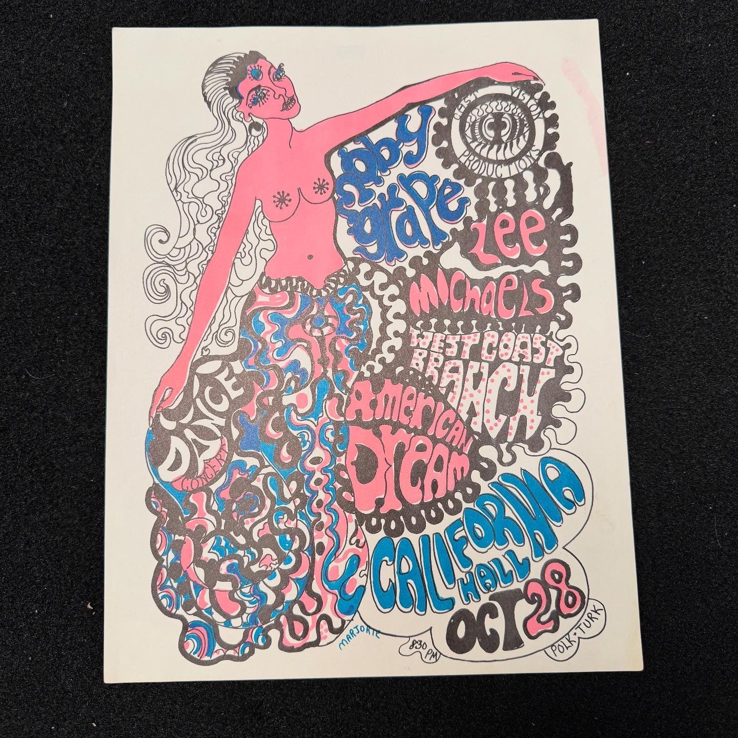 Moby Grape, Lee Michaels, etc at California Hall. Original 1967 flyer. Measures 8.5X11". There is a pink mark near the upper right corner, but that looks like it could be from the printing. Otherwise looks pretty perfect!