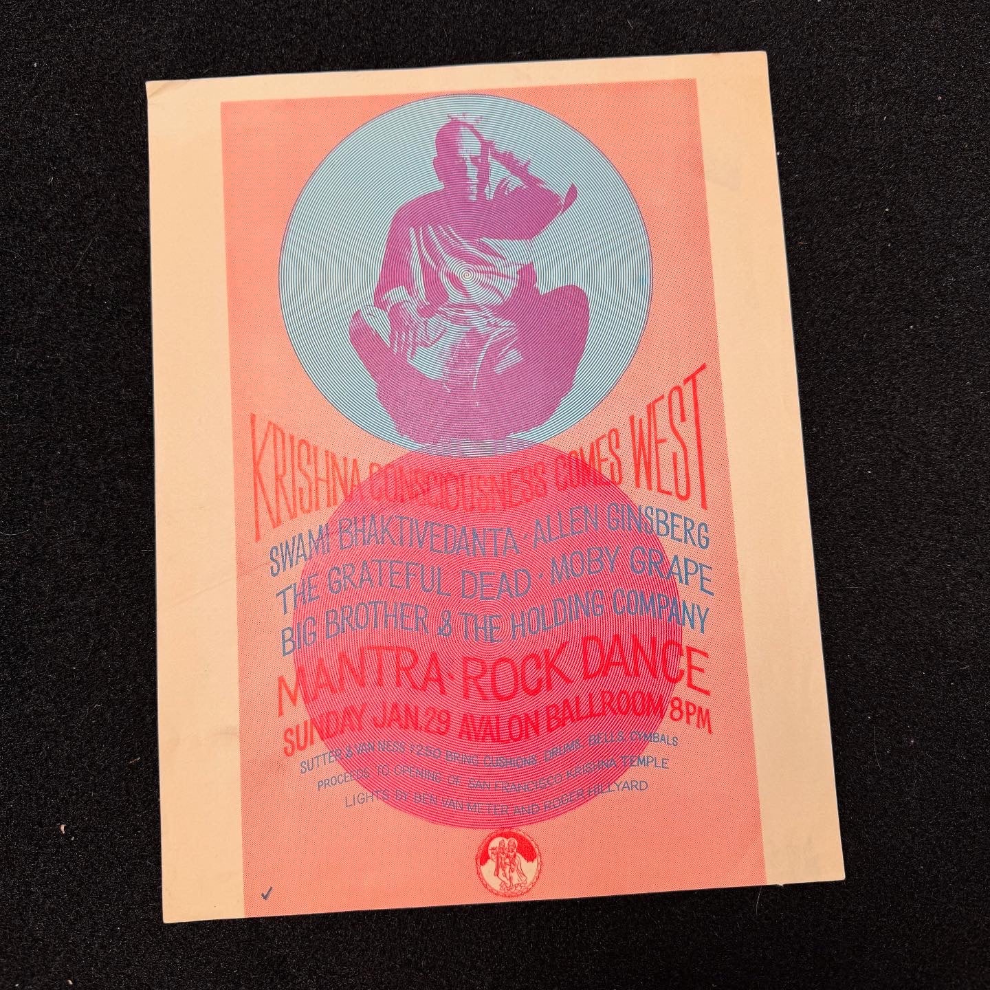 Krishna Consciousness Comes West flyer from 1967. Allen Ginsberg, Grateful Dead, Moby Grape... Measures 8.5X11". There is a check mark on the lower left corner and a fold crease in the middle. See pics. Otherwise, looks great!