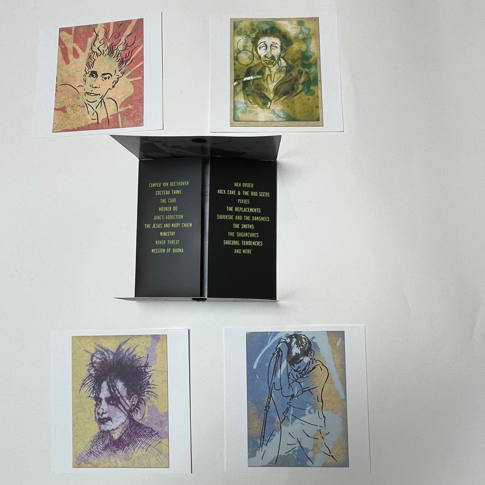 Promo only art print set that was given out for the release of the Left Of The Dial box set in 2004. Features four drawings by artist John Seabury of Ian Curtis, Robert Smith, John Lydon and Shane MacGowan. Housed in a resealable multi-flap sleeve. It's only fitting that the packaging is the same size as a 7" single.